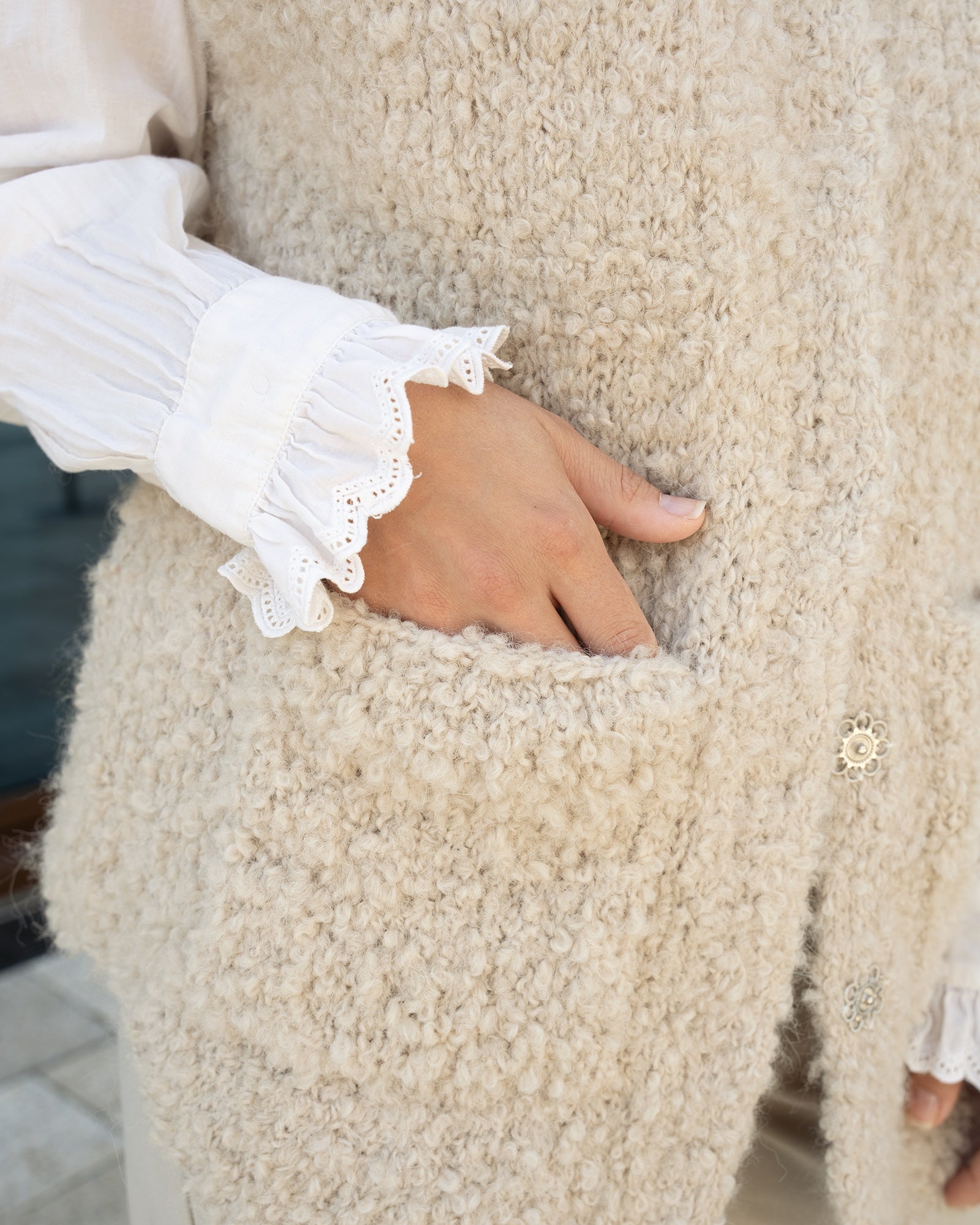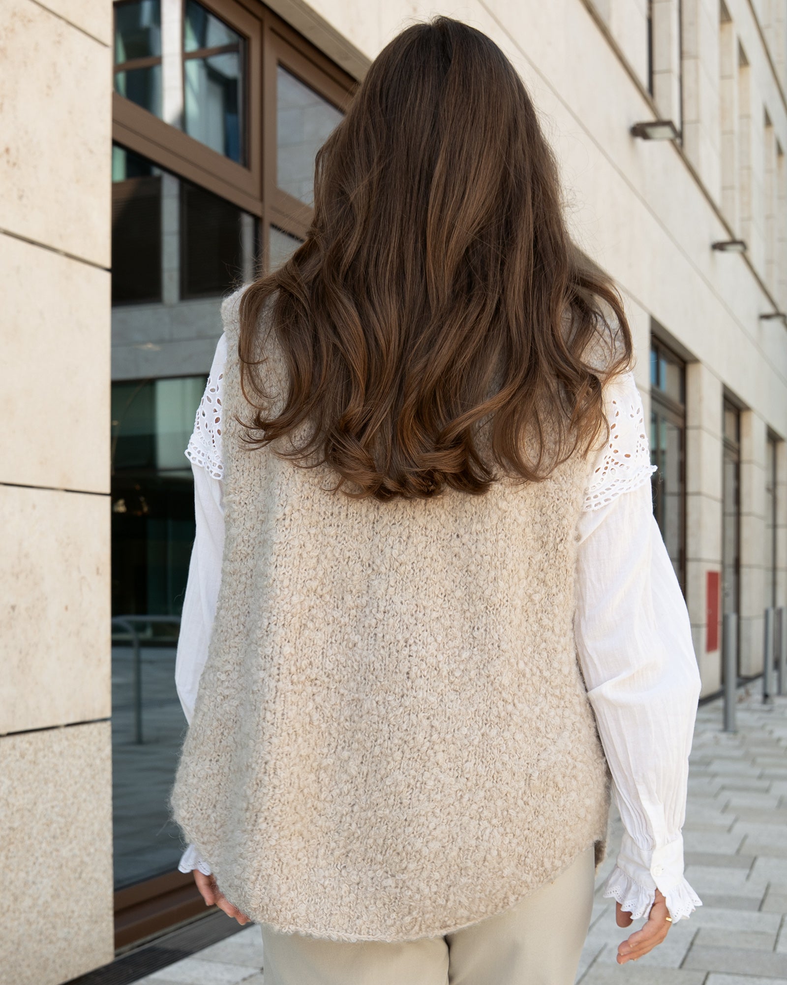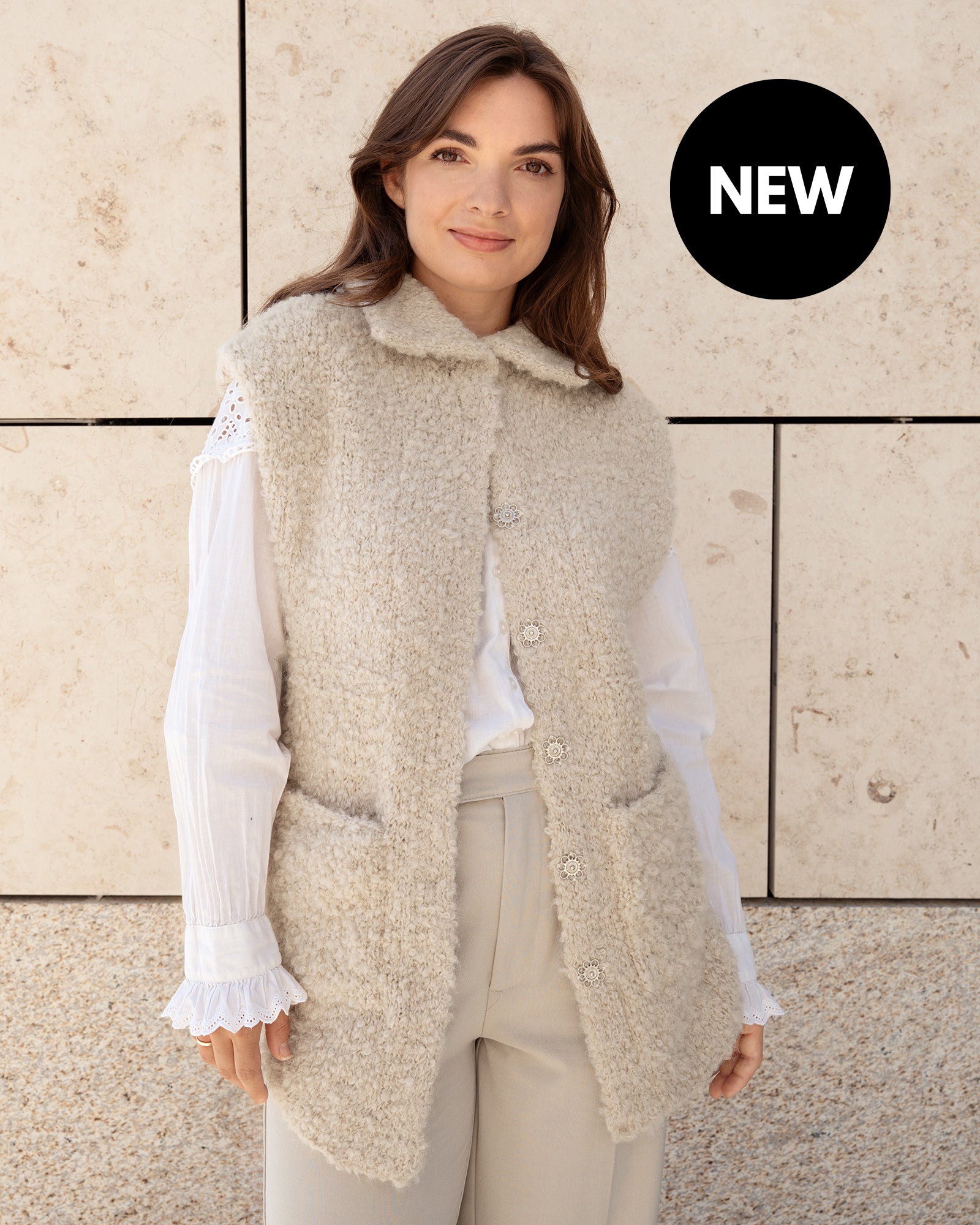Die Arcticteddyvest ist eine oversized getragene, vom klassischen Hemd inspirierte Weste. Sie wird nahtlos von oben nach unten in glatt rechts gearbeitet und gewinnt durch das verwendete Bouclé-Garn ihre weiche, voluminöse Struktur. Ein eleganter Hemdkragen, eine schmale Knopfleiste mit unsichtbaren Druckknöpfen sowie aufgesetzte Taschen verleihen ihr eine klare, moderne Linie – ideal über Blusen oder Hemden und warm genug für die kommende Herbstsaison. Konstruktiv beginnt das Modell mit der oberen Rückenpartie: Zunächst werden Maschen angeschlagen, anschließend formen seitliche Zunahmen die Schultern und zeichnen eine schräg verlaufende Schulterlinie nach. Nach Abschluss der Zunahmen wird bis zur gewünschten Armausschnitttiefe in Reihen weitergestrickt. Im nächsten Schritt werden die Vorderteile direkt an den Schultern angestrickt; gleichzeitig modellieren Zunahmen und Abnahmen sowohl die Armausschnitte als auch den vorderen Halsausschnitt. Sobald die jeweilige Armausschnitthöhe erreicht ist, werden Vorder- und Rückenteil verbunden; zusätzliche Aufnahmen im Achselbereich sorgen für eine angenehm lockere, komfortable Weite. Der Körper wird in Reihen bis zur Gesamtlänge gearbeitet, anschließend erzeugen verkürzte Reihen in den Vorderteilen eine schräg verlaufende, verlängerte Front und Rückteil. Die Ausarbeitung setzt auf hochwertige Details: Die Armausschnitte erhalten einen dekorativen I-Cord-Rand, die Blenden werden im Doppelstrick angestrickt. Besonderes Highlight ist der Doppelstrickkragen mit verstärktem Kragensteg und spitz zulaufenden Kragenspitzen, geformt über verkürzte Reihen und direkt in die Kragenöffnung eingestrickt. Zwei aufgesetzte Taschen mittig auf den Vorderteilen geben der Weste einen sportiv-coolen Akzent und runden das Gesamtbild ab. Die Druckknöpfe werden am Ende unsichtbar in die Blende eingenäht – so bleibt die puristische Optik der Arcticteddyvest erhalten.