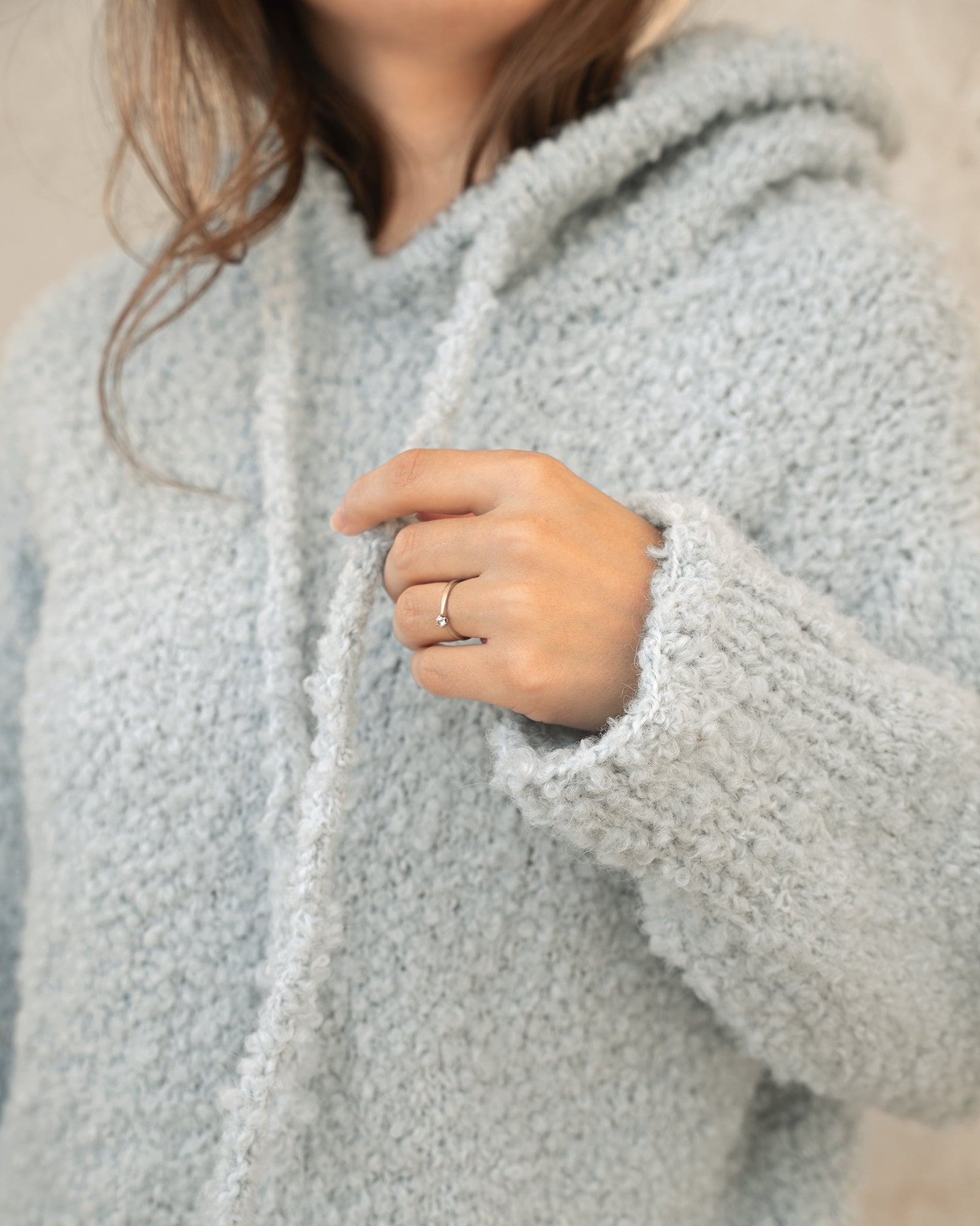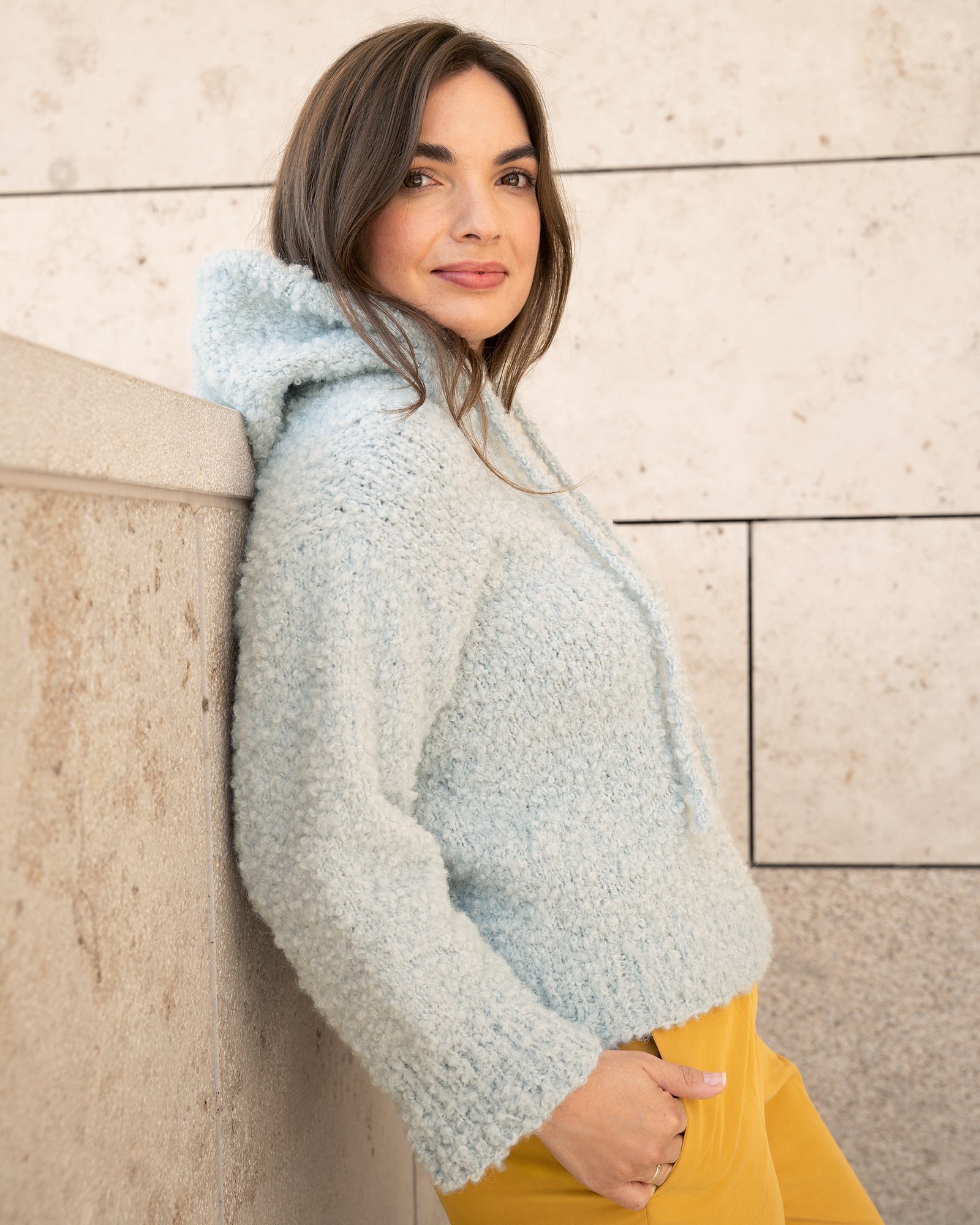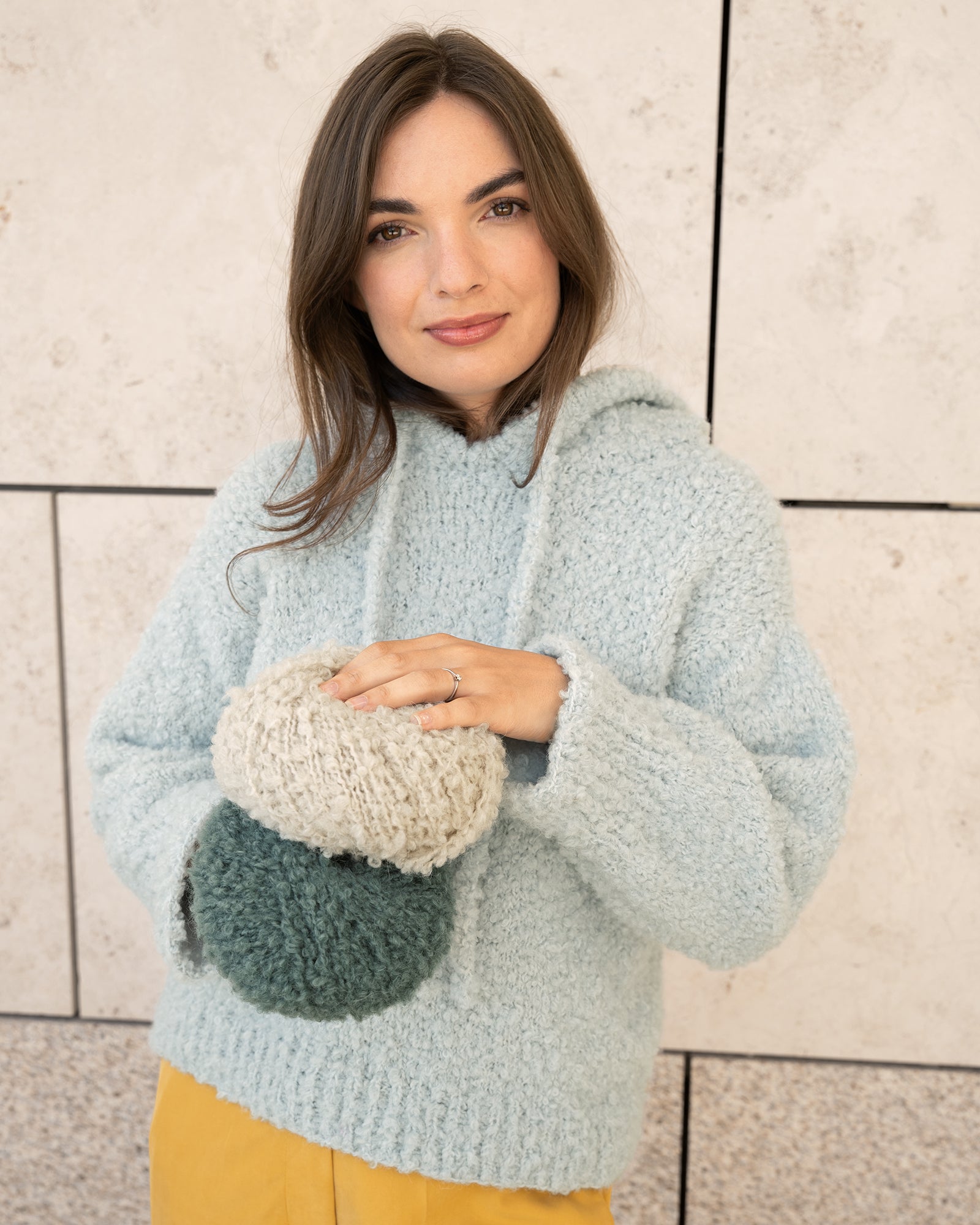 Der Bouclehoodie setzt auf eine klare, nahtlose Konstruktion mit weichem Fall und sportlicher Linie. Entwickelt wurde er so, dass sich Form und Sitz organisch aus der Strickrichtung ergeben: von oben nach unten, ohne Nähte und mit dezenten Formgebungen, die im getragenen Zustand besonders sauber wirken. Gestartet wird mit der oberen Rückenpasse, die mittels verkürzter Reihen an die natürliche Schulterneigung angepasst wird. Seitliche Maschenaufnahmen rechts und links formen die Armausschnitte und sorgen früh für eine stabile, passgenaue Breite. Nach Erreichen der Armausschnitthöhe werden die Rückenmaschen stillgelegt. Anschließend werden die beiden Vorderteilhälften direkt an den Schultern aufgenommen und separat gearbeitet; auch hier sorgen verkürzte Reihen für die exakte Formgebung. Sobald die gewünschte Tiefe des vorderen Halsausschnitts erreicht ist, werden zwischen den Vorderteilen neue Maschen angeschlagen, die Teile verbunden und bis zur Armausschnitthöhe in Reihen weitergestrickt. Danach schließen sich Vorder- und Rückenteil zum Rumpf, der in Runden bis zur gewünschten Länge gearbeitet wird. Die Ärmel entstehen direkt aus den Armöffnungen und werden in Runden gestrickt; seitliche Abnahmen modellieren eine schlanke, harmonische Silhouette. Zum Abschluss wird eine raffinierte Kapuze separat gearbeitet. Verkürzte Reihen an den vorderen seitlichen Kapuzenteilen geben den perfekten Sitz, die Kapuze fließt sauber in den Halsausschnitt über. Mit der 3-Nadel- Abkettmethode wird die Kapuze ordentlich und flach miteinander verbunden. Optional lässt sich die Kapuze mit oder ohne Kordel versehen – als schlichtes I-Cord-Band für einen reduzierten, sportiven Look.