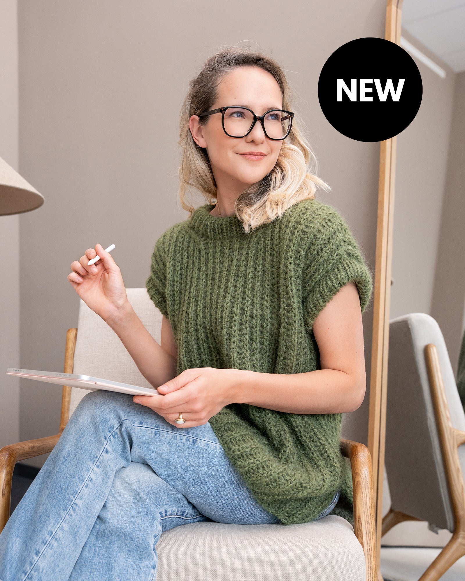 Anschließend werden die Seitennähte oberhalb des Schlitzes bis zum Armausschnitt geschlossen. Aus den Armlöchern werden neue Maschen aufgenommen, zur Runde geschlossen und im Bündchenmuster gestrickt. Nach dem Abketten werden auch die Armausschnittblenden zur Hälfte nach innen umgeschlagen und auf der Innenseite angenäht.