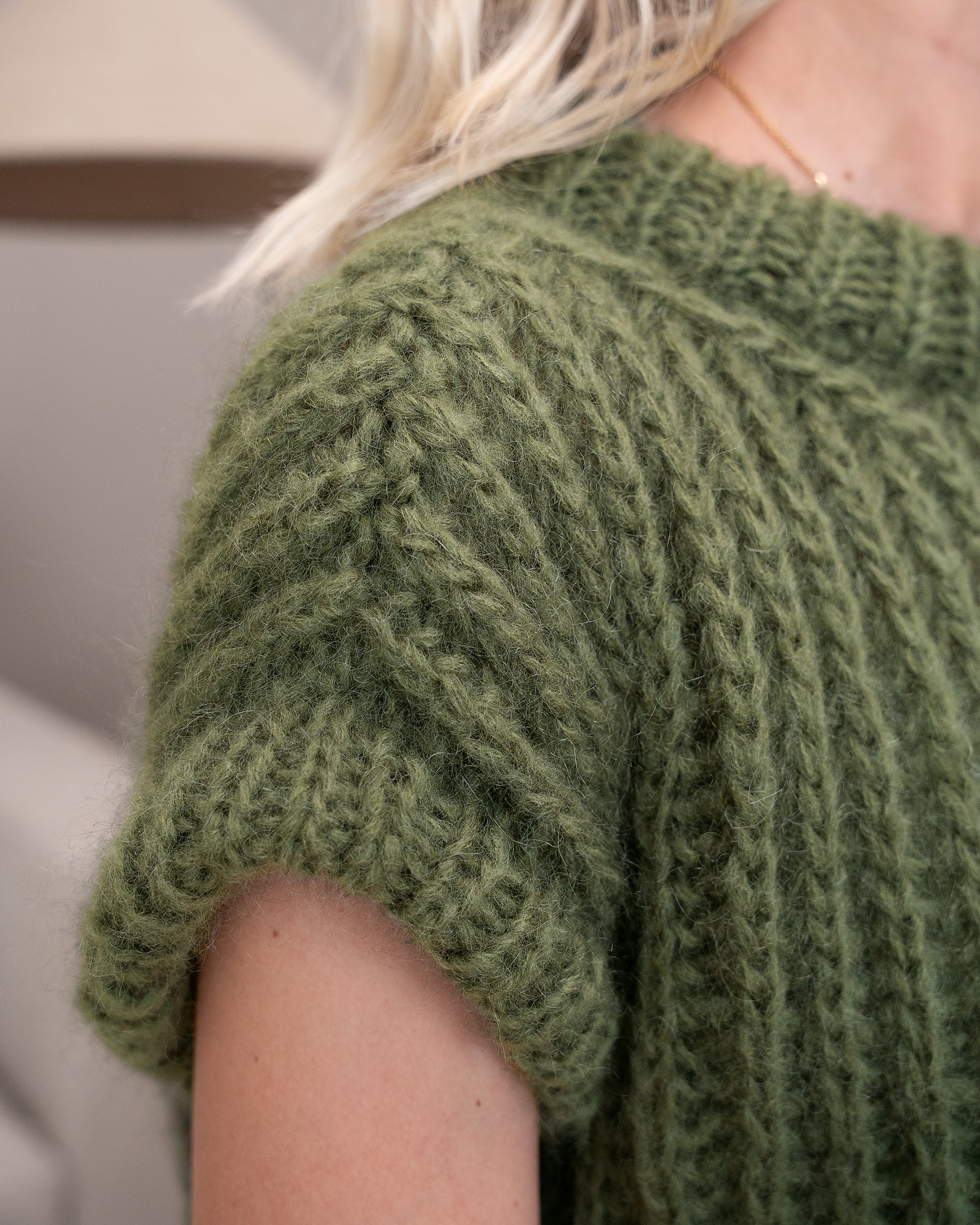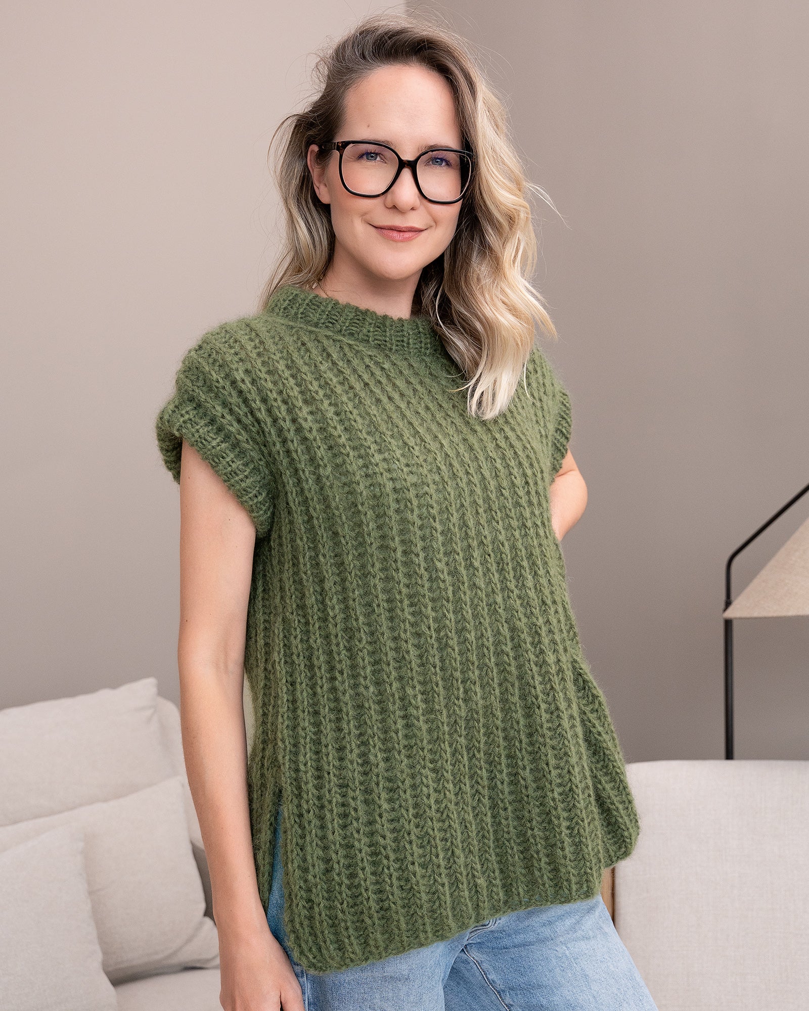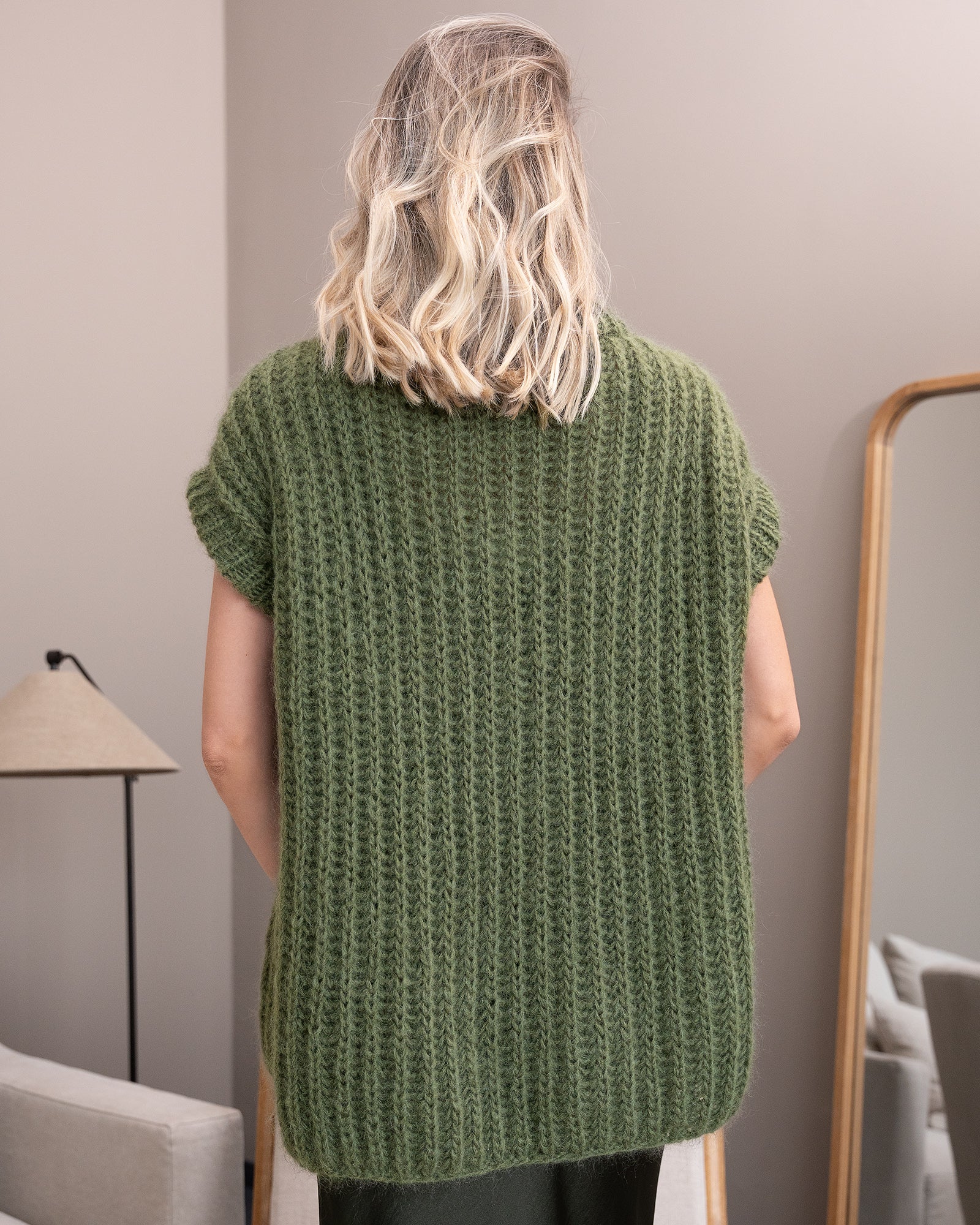 Der GioSlipover wird zunächst in Einzelteilen von unten nach oben gestrickt. Nach dem Schließen der Schulternähte werden Maschen rund um den Halsausschnitt aufgenommen, um den Kragen im Rippenmuster in Runden zu arbeiten. Nach dem Abketten wird der Kragen zur Hälfte nach innen umgeschlagen und auf der Innenseite angenäht.