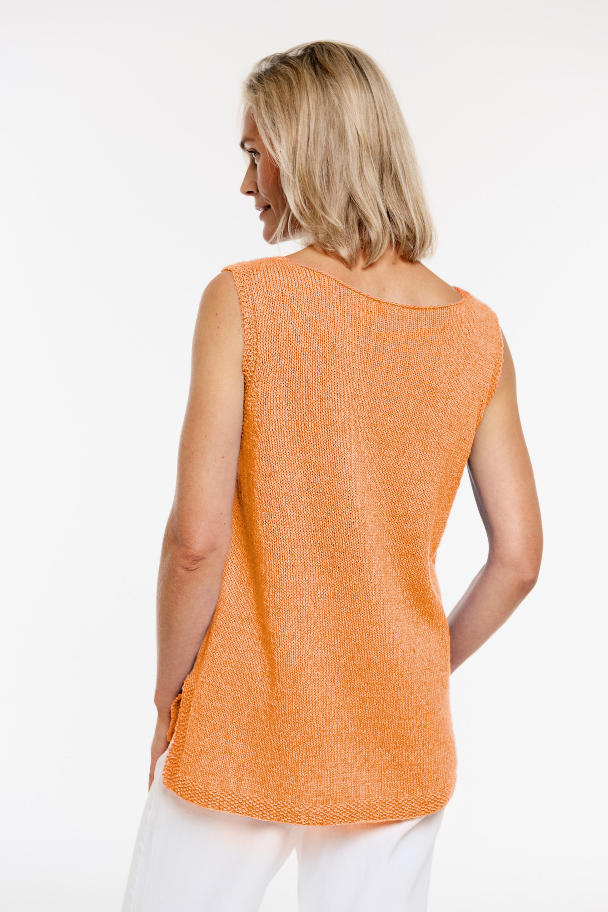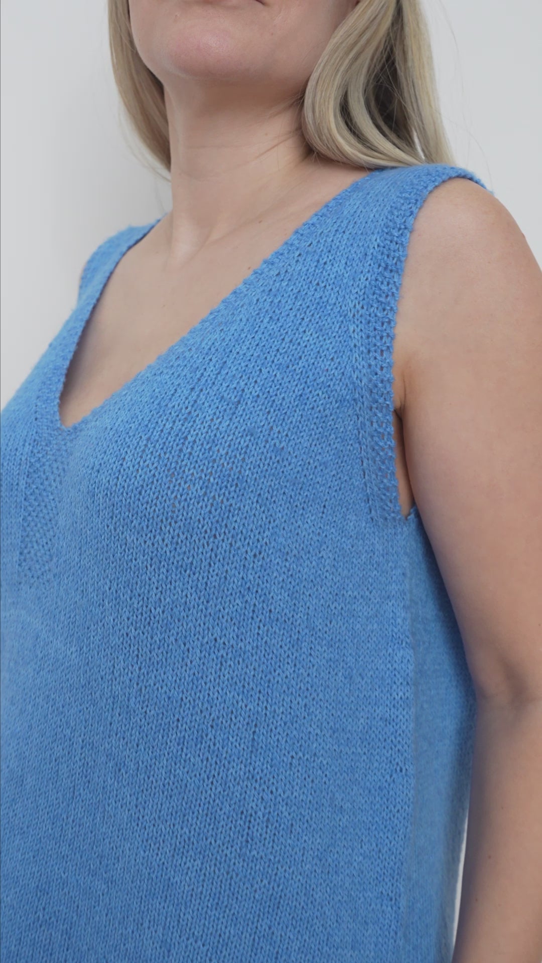 Das luftige Romina Top wird nahtlos von oben nach unten gestrickt. Zuerst werden Maschen für das Rückenteil angeschlagen und über die Höhe der Armausschnitte in Hin- und Rückreihen mit seitlichen Zunahmen für die Armausschnittrundung gestrickt. Nach dem Stilllegen der Rückenteilmaschen werden die Vorderteile nacheinander gearbeitet. Die Träger entstehen durch Aufnehmen von Maschen aus der Anschlagkante des Rückenteils. Nach den Trägern folgen Zunahmen für den V-Ausschnitt und später für die Armausschnittrundung. Unter den Achseln werden Vorder- und Rückenteil verbunden, der V-Ausschnitt geschlossen und der Rumpf in Runden weitergearbeitet. Durch Zunahmen entlang der Seitenlinien entsteht eine A-Form. Für die Schlitze wird zum Abschluss Vorder- und Rückenteil getrennt beendet. Die Schlitzblenden sowie die Ärmel- und V-Ausschnittblenden werden im kleinen Perlmuster mit angestrickt.